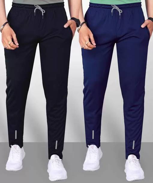 Solid blue and black track pants with stretchable waist, soft fabric, ideal for daily wear and light exercise.