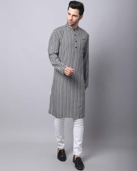 Stylish long kurta with check pattern and mandarin collar ideal for festive and casual wear