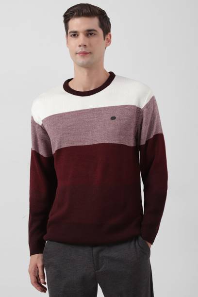 Men colorblock round neck maroon sweater, lightweight and soft fabric, stylish and comfortable for daily wear.