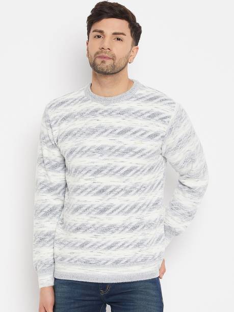 Men Self Design Round Neck Blue, White Sweater