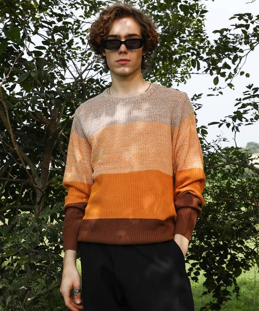 Men Self Design V Neck Dark Blue, Beige Sweater