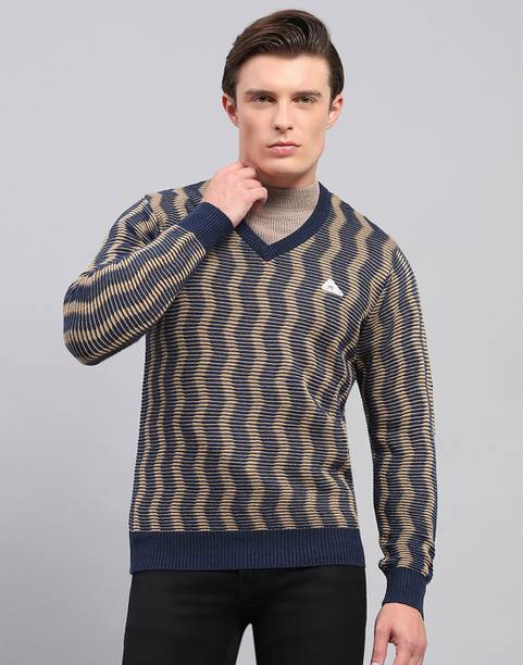 Men striped round neck grey and black sweater, soft and breathable, lightweight and comfortable for daily wear.
