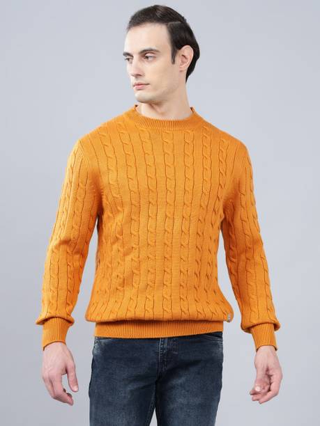Men Woven Round Neck Yellow Sweater